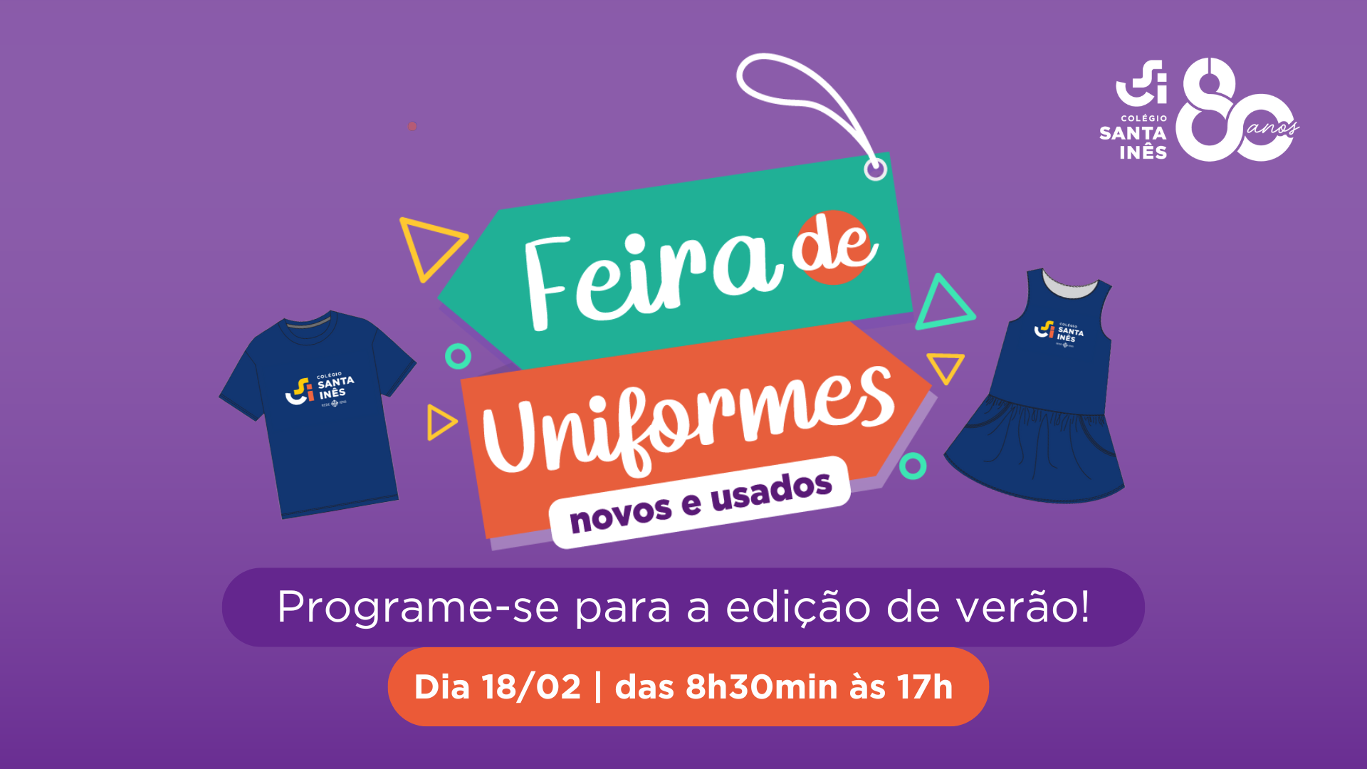 Com a proximidade do início do ano letivo, o Colégio Santa Inês convida as famílias a se organizarem para esse novo ciclo por meio de mais uma edição da Feira de Uniformes. O evento acontecerá no dia 18 de fevereiro, das 8h30min às 17h, na sala 102 do prédio B (sala dos espelhos), e será uma excelente oportunidade para revisar o que já está no armário, adquirir novas peças, trocar uniformes em bom estado ou doar aqueles que não servem mais. A iniciativa busca incentivar o consumo consciente e apoiar as famílias na organização dos uniformes escolares.