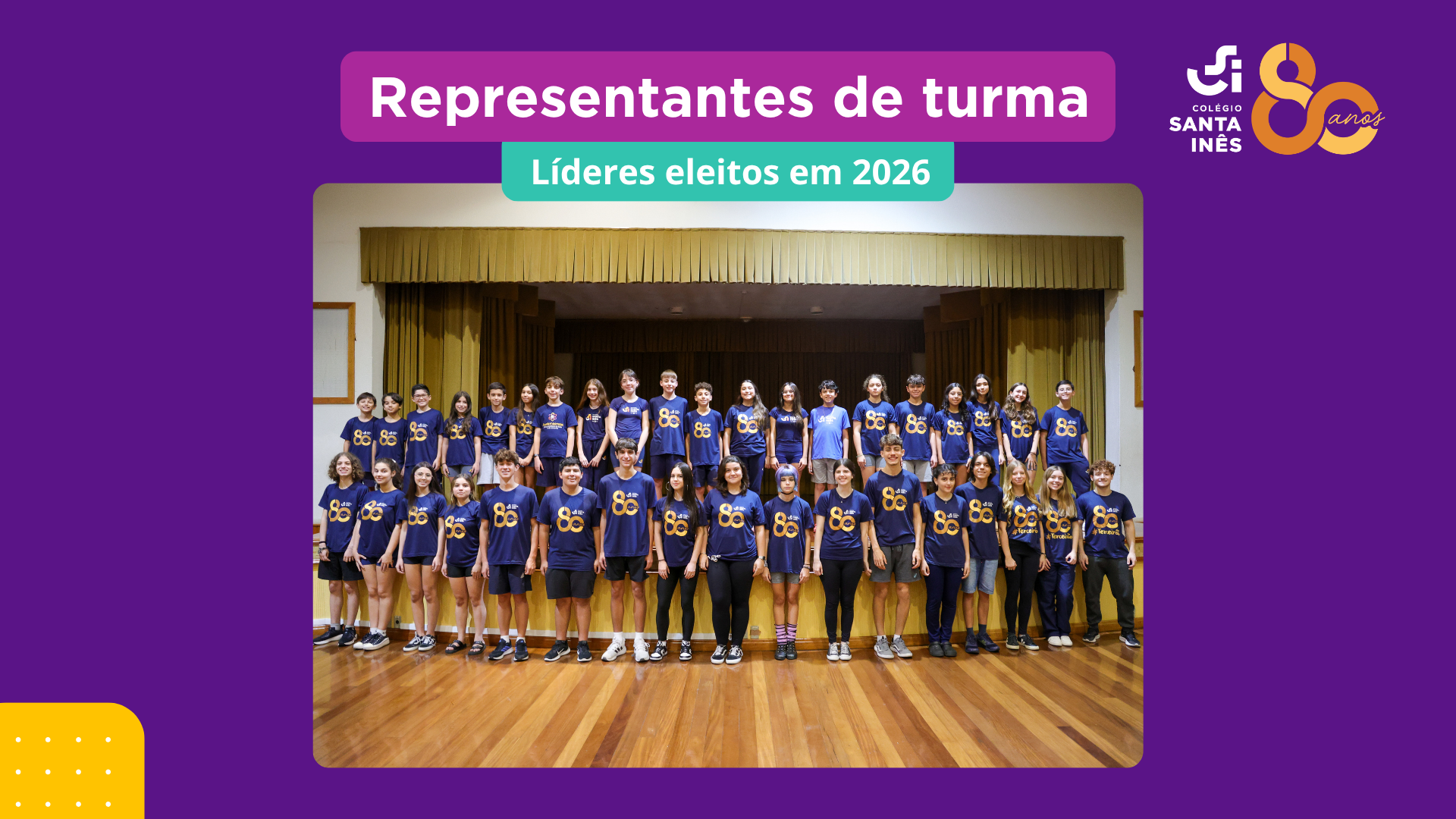 No dia 17 de abril, o Colégio Santa Inês realizou a cerimônia de posse dos novos representantes de turma para a gestão de 2026, no Auditório Madre Teresa. O evento contou com a presença dos estudantes eleitos, da diretoria executiva do GESI (Grêmio Estudantil do Colégio Santa Inês) e da equipe diretiva da escola. A cerimônia seguiu o que é estabelecido pelo Estatuto do Grêmio Estudantil, pois os líderes de turma (do 6º ano do Ensino Fundamental ao 3º ano do Ensino Médio) integram o conselho representativo do GESI, sendo uma das estruturas mais importantes de representação estudantil.