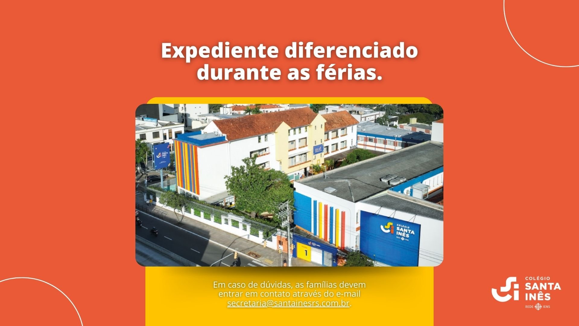O Colégio Santa Inês informa às famílias que o expediente externo ocorrerá em horário especial durante o período de recesso de verão. A medida busca organizar a demanda e facilitar o planejamento das famílias que pretendem resolver questões administrativas ao longo das férias.